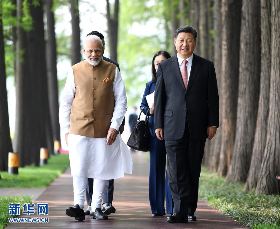 4月27日和28日,國家主席習近平在武漢東湖賓館同印度總理莫迪舉行非正式會晤。這是4月28日,習近平同莫迪散步交談。 新華社記者 燕雁攝