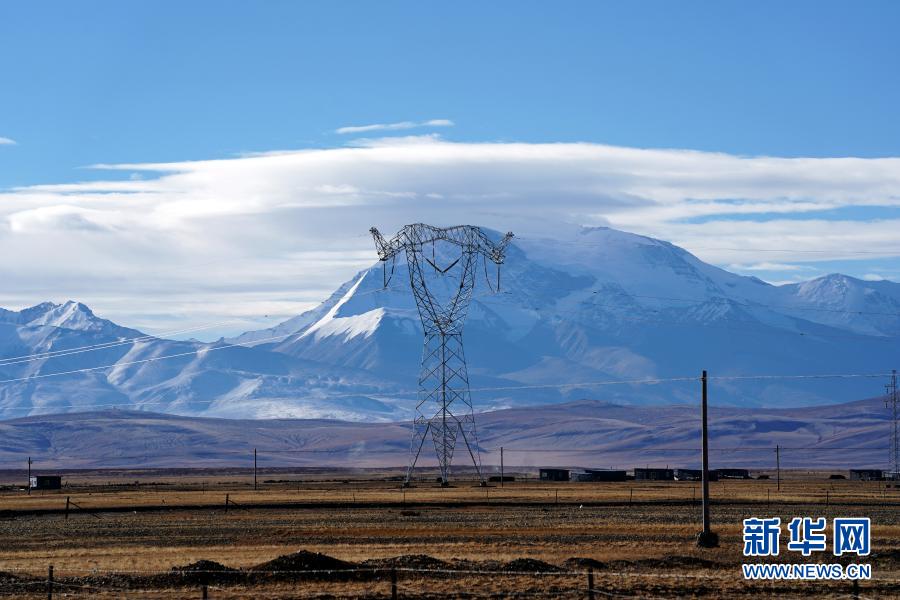 這是2020年11月29日在西藏阿里地區普蘭縣拍攝的西藏阿里與藏中電網聯網工程輸電鐵塔。新華社記者 詹彥 攝