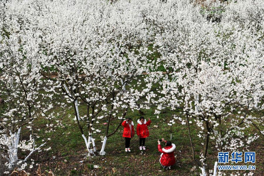 游客在貴州省黔西縣新仁苗族鄉化屋村的櫻桃樹下留影(2月19日攝)。新華社記者 楊文斌 攝
