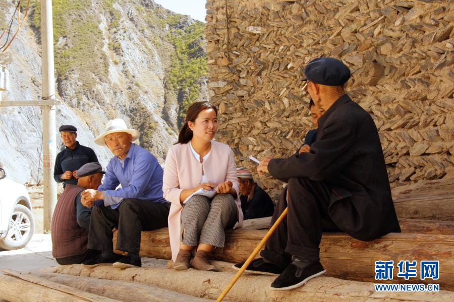 甘肅省甘南藏族自治州舟曲縣扶貧辦副主任張小娟(右二)在下鄉時向群眾了解情況(2018年4月攝)。2019年10月7日,時任縣扶貧辦副主任的張小娟在完成曲告納鎮上大年村脫貧攻堅縣級抽樣調查工作后,返程途中所乘車輛不慎墜江,因公殉職。新華社發