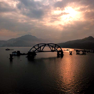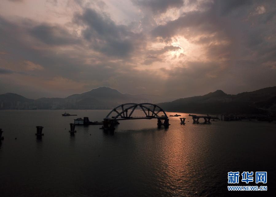 2月25日傍晚,將軍澳海灣斜陽夕照,波光粼粼。遠遠看去,一艘巨大的駁船“馱”著一座雙拱鋼橋靜靜地停泊在海面中間。