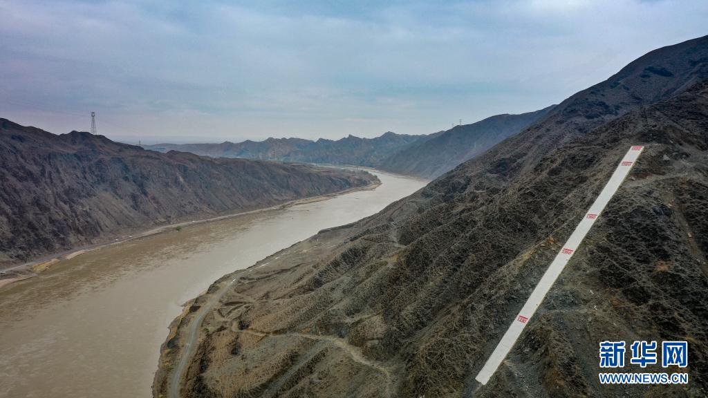 這是位于寧夏中衛市黃河黑山峽河段的水位標記(4月3日攝,無人機照片)。