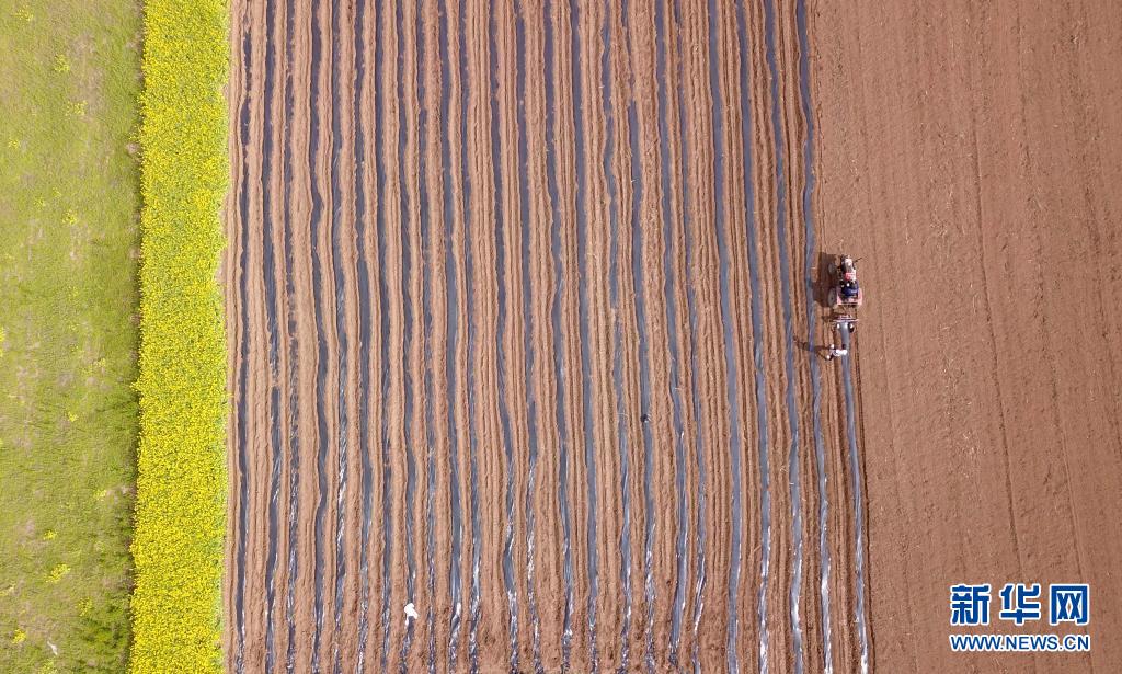 4月6日,在河南省洛陽(yáng)市汝陽(yáng)縣蔡店鄉(xiāng)孟腦村,農(nóng)民駕駛拖拉機(jī)在辣椒地里覆蓋地膜,為及時(shí)移栽辣椒做好準(zhǔn)備工作(無(wú)人機(jī)照片)。
