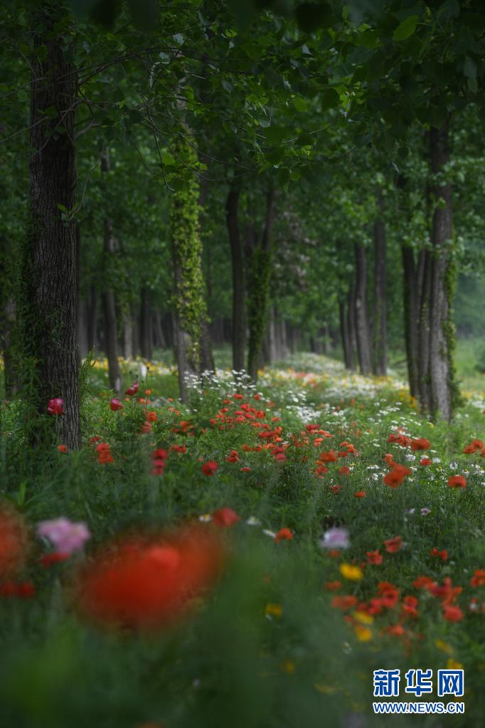 在東林鎮東升村,田野邊的樹林中鮮花盛開(5月7日攝)。