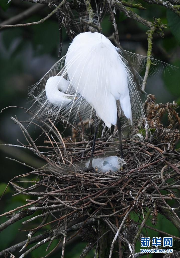 在南昌市新建區象山森林公園內,白鷺守護著雛鳥(5月18日攝)。