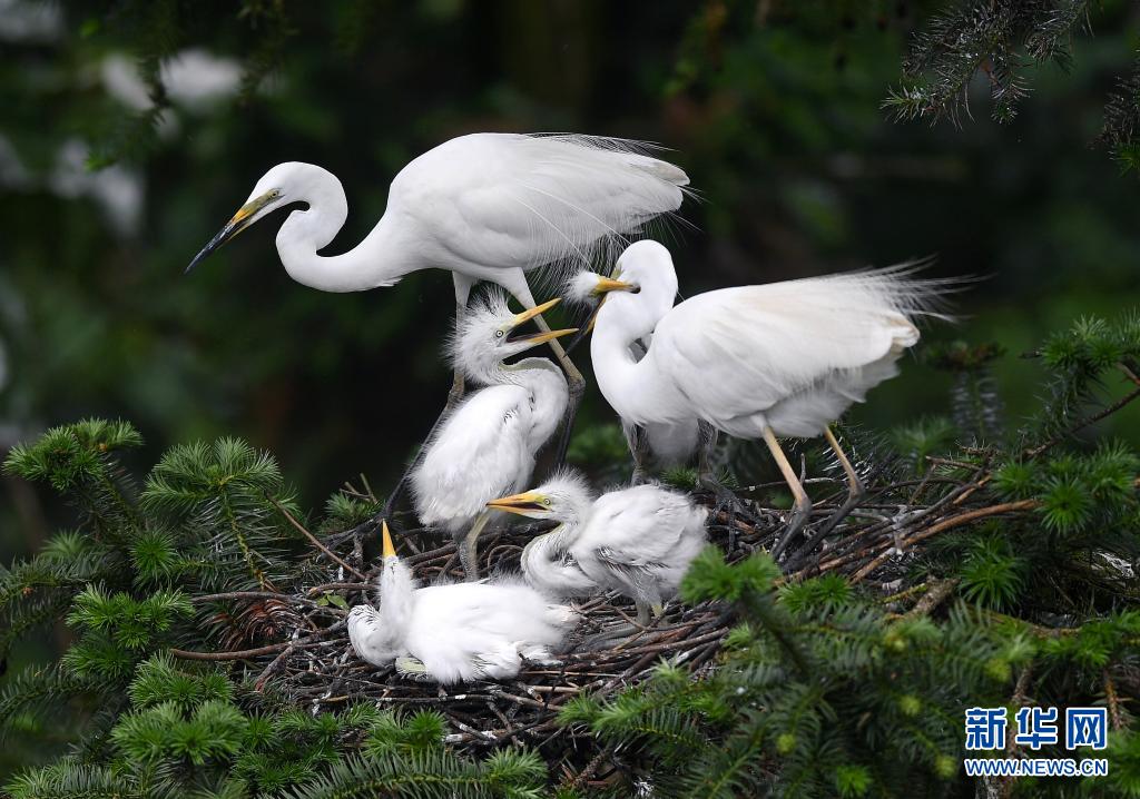 在南昌市新建區象山森林公園內,白鷺在給雛鳥喂食(5月18日攝)。