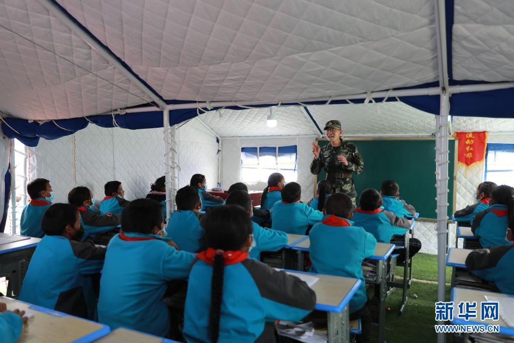 5月24日,武警青海總隊果洛支隊機動大隊排長張國睿為花石峽鎮藏文中心寄宿制小學的孩子上課。新華社記者 劉新 攝