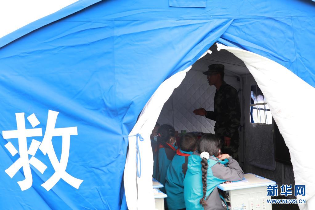 5月24日,武警青海總隊果洛支隊機動大隊排長張國睿為花石峽鎮(zhèn)藏文中心寄宿制小學(xué)的孩子上課。新華社記者 劉芳 攝