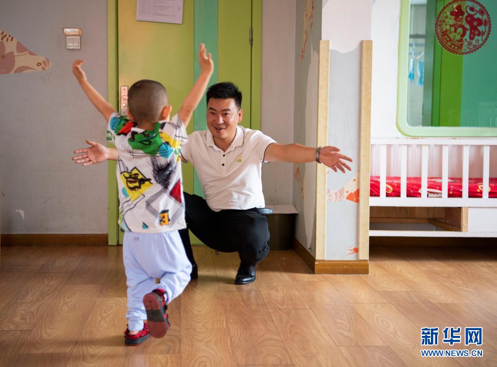 在太原市社會(huì)(兒童)福利院,一名小朋友跑向黨龍祥(5月31日攝)。新華社記者 楊晨光 攝