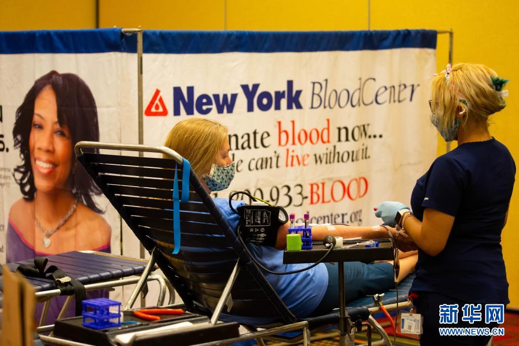 6月14日,在美國(guó)紐約州長(zhǎng)島地區(qū)的尤寧代爾,獻(xiàn)血志愿者在美國(guó)紐約血液中心舉行的獻(xiàn)血活動(dòng)上獻(xiàn)血。