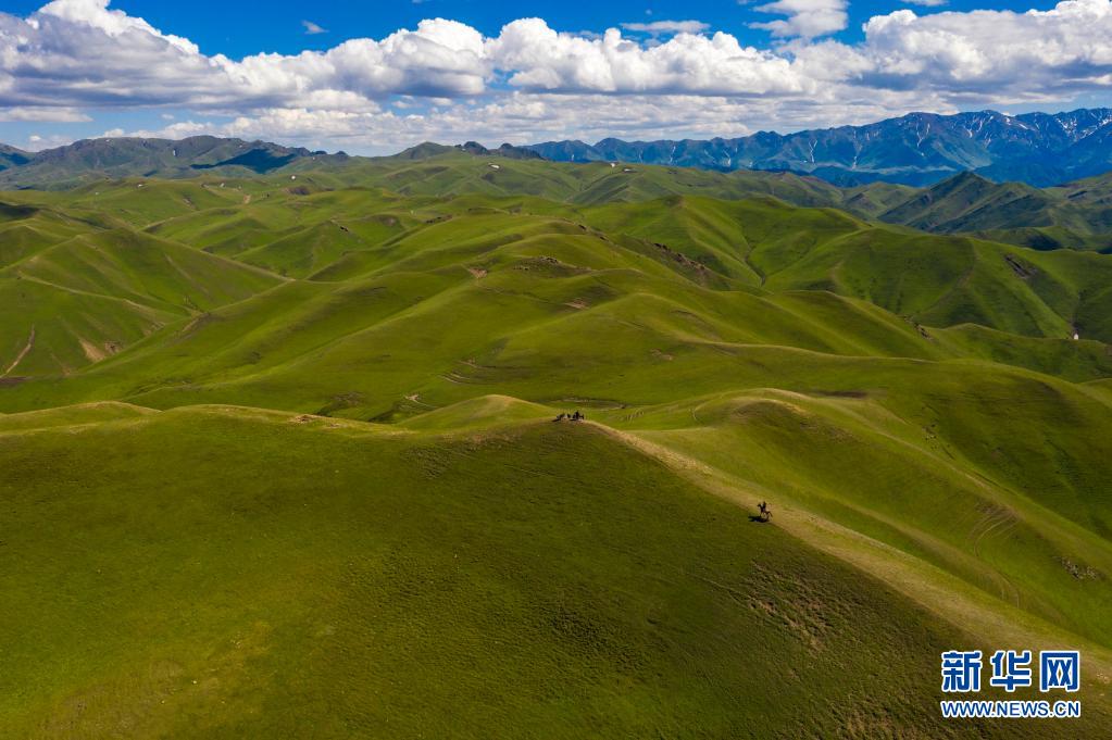 新疆裕民縣的牧民策馬奔馳在巴爾魯克山區夏牧場上(6月15日攝,無人機照片)。