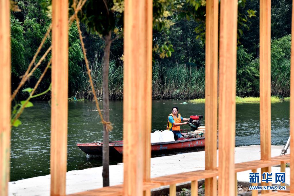6月20日,在微山縣南陽鎮,郵遞員王少朋駕駛郵船為柳溝村村民投遞郵件。