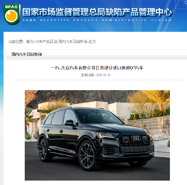 日前,一汽-大众汽车有限公司根据《缺陷汽车产品召回管理条例》和《缺陷汽车产品召回管理条例实施办法》的要求,向国家市场监督管理总局备案了召回计划。决定自今日起,召回2020年7月31日至2020年8月6日生产的部分进口2021款Q7汽车,共计3辆。