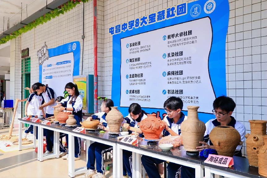 嘉宾沿定制路线参观,在学生讲解中了解学校 76 年办学历程。益才广场上,第五届科技体育艺术节现场展示陶艺、扎染、麻绳编织等非遗技艺,武术和盅盘舞等节目展现浓郁本土特色,嘉宾通过投票互动直观感受学校五育融合的实践成果。