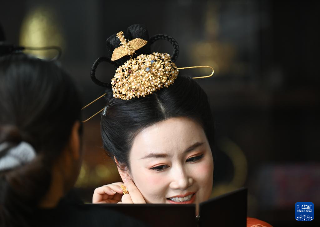 一名汉服爱好者在马赛的工作室内试戴花丝镶嵌技艺制作的头饰(3月7日摄)。