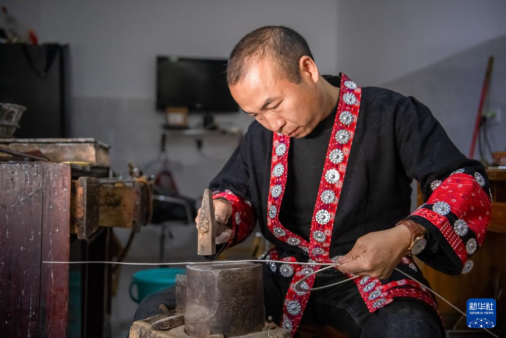 4月8日,手艺人在贵州省黄平县新州镇文星社区一家银饰店内制作银饰。