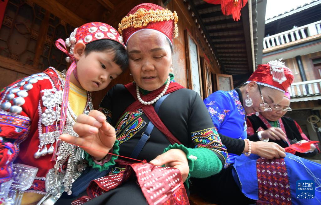 4月8日,苗族妇女在贵州省黄平县谷陇镇大寨村手工绣银片。