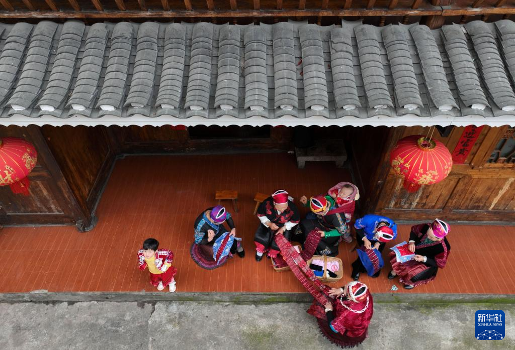 4月8日,苗族妇女在贵州省黄平县谷陇镇大寨村手工绣银片(无人机照片)。