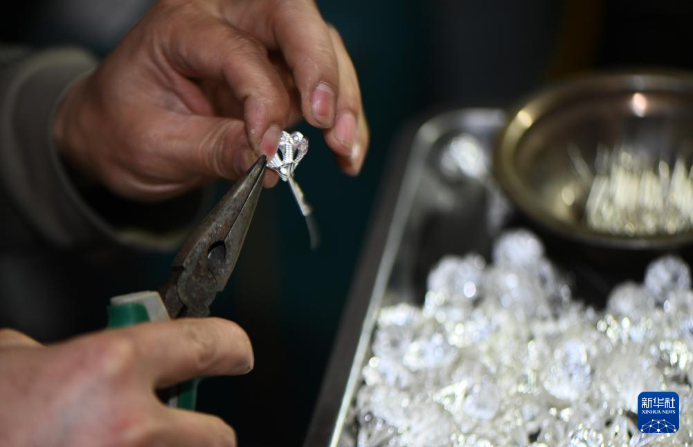 4月8日,手艺人在贵州省黄平县谷陇镇一家银饰店内制作银饰。