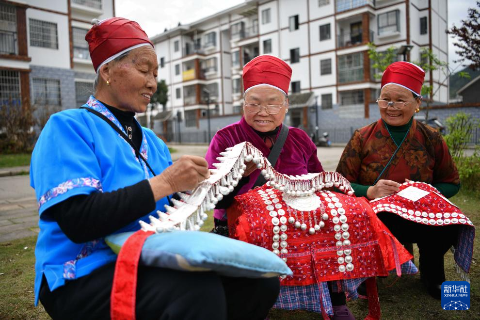 4月8日,苗族妇女在贵州省黔东南苗族侗族自治州黄平县谷陇镇苗岭社区绣银片。