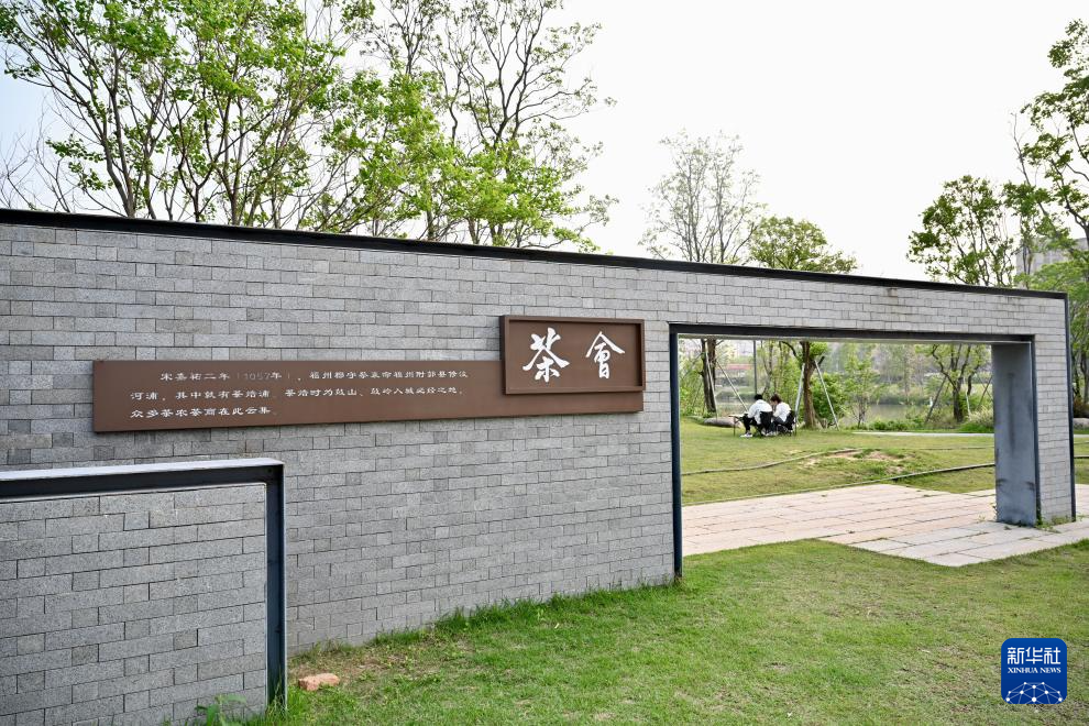 4月14日,福州晋安湖公园“茶会”文化墙旁,市民在户外休闲。