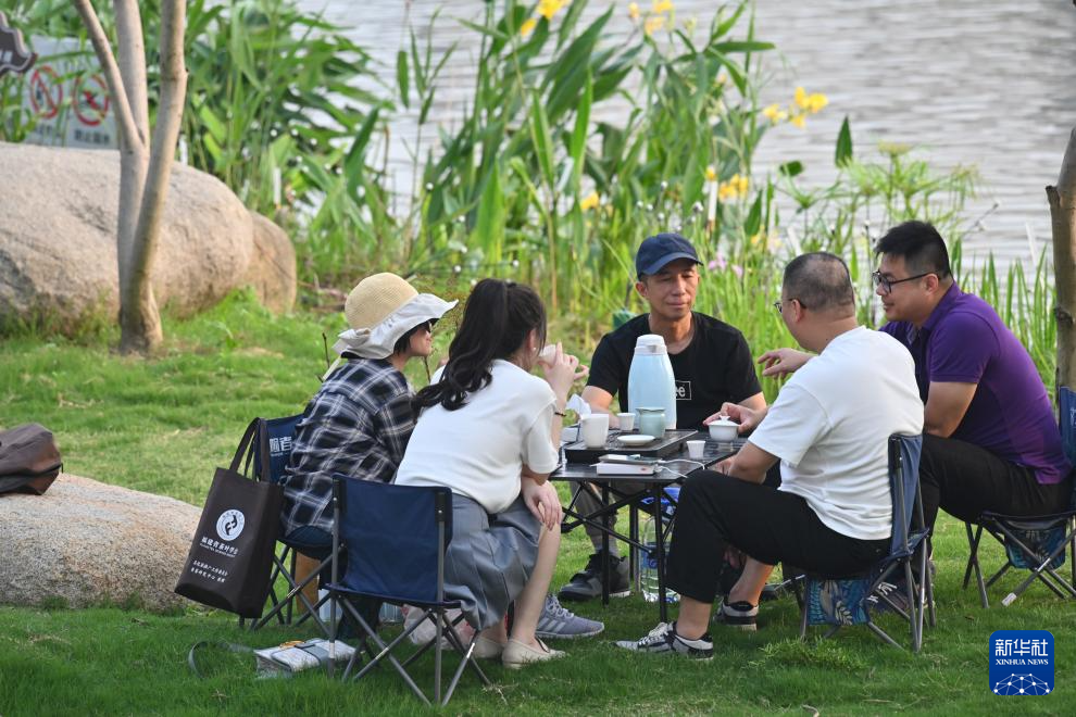 4月14日,在福州晋安湖公园,市民在湖畔泡茶聊天。