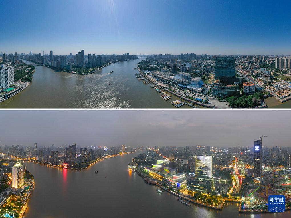 拼版照片:上图为钢结构施工阶段的白鹅潭大湾区艺术中心(新华社发,2022年7月21日摄);下图为即将竣工的白鹅潭大湾区艺术中心(新华社记者刘大伟2023年12月27日摄)。