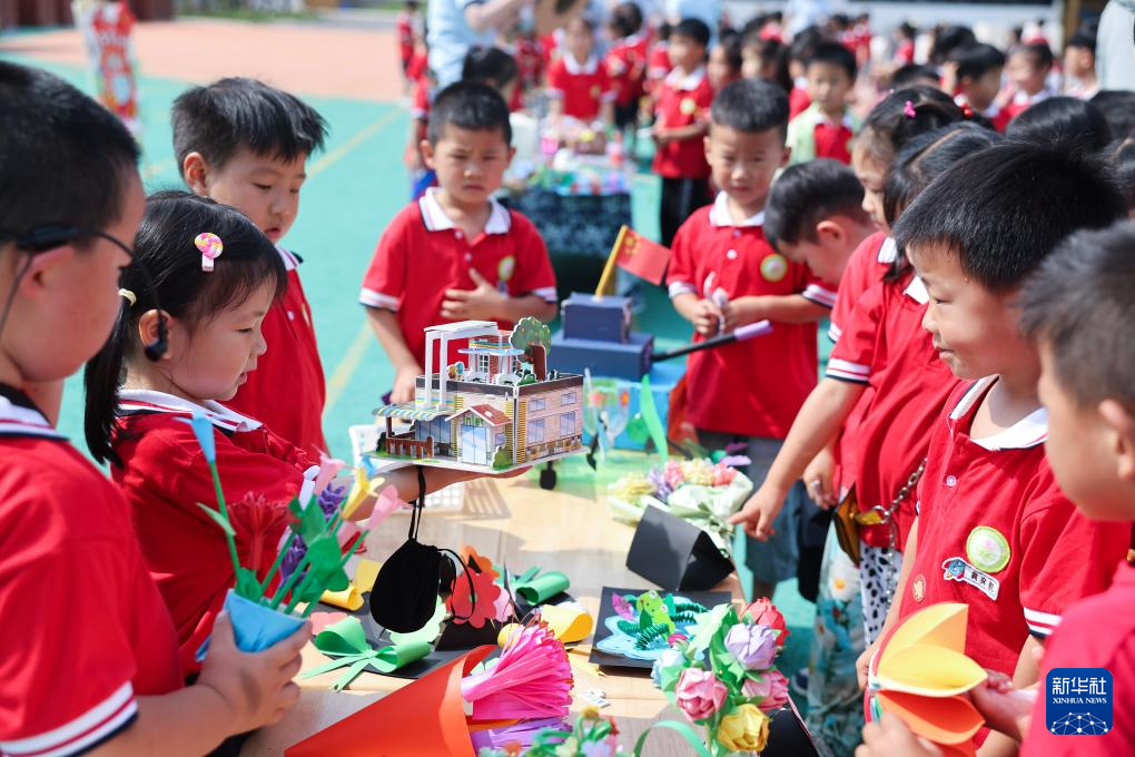 6月13日,孩子们在参加校园剪纸义卖活动。