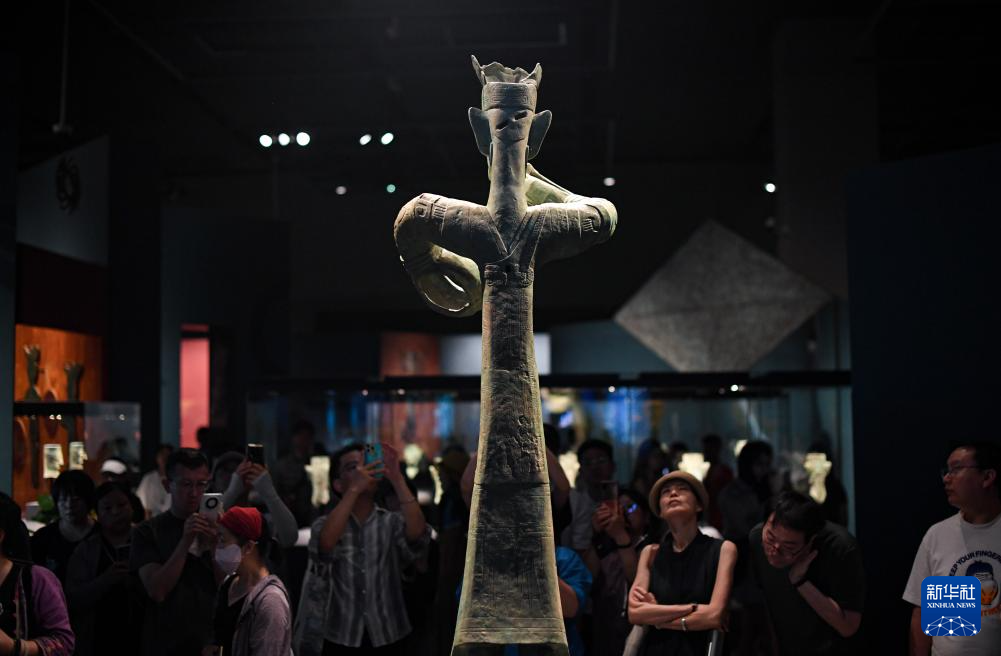 6月27日,一名观众在拍照时模仿竖披发青铜立人像的姿势。