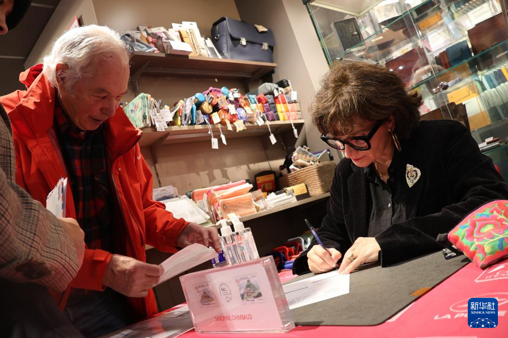 10月18日,在法国巴黎举行的《中法建交六十周年》纪念邮票首发仪式现场,邮票设计者之一、法国艺术家桑德里娜·尚博为集邮爱好者签名。