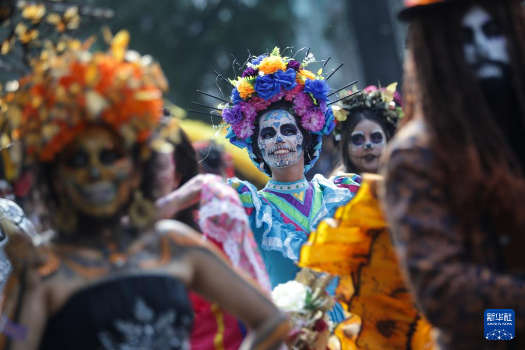 这是11月2日在墨西哥首都墨西哥城拍摄的亡灵节游行现场。