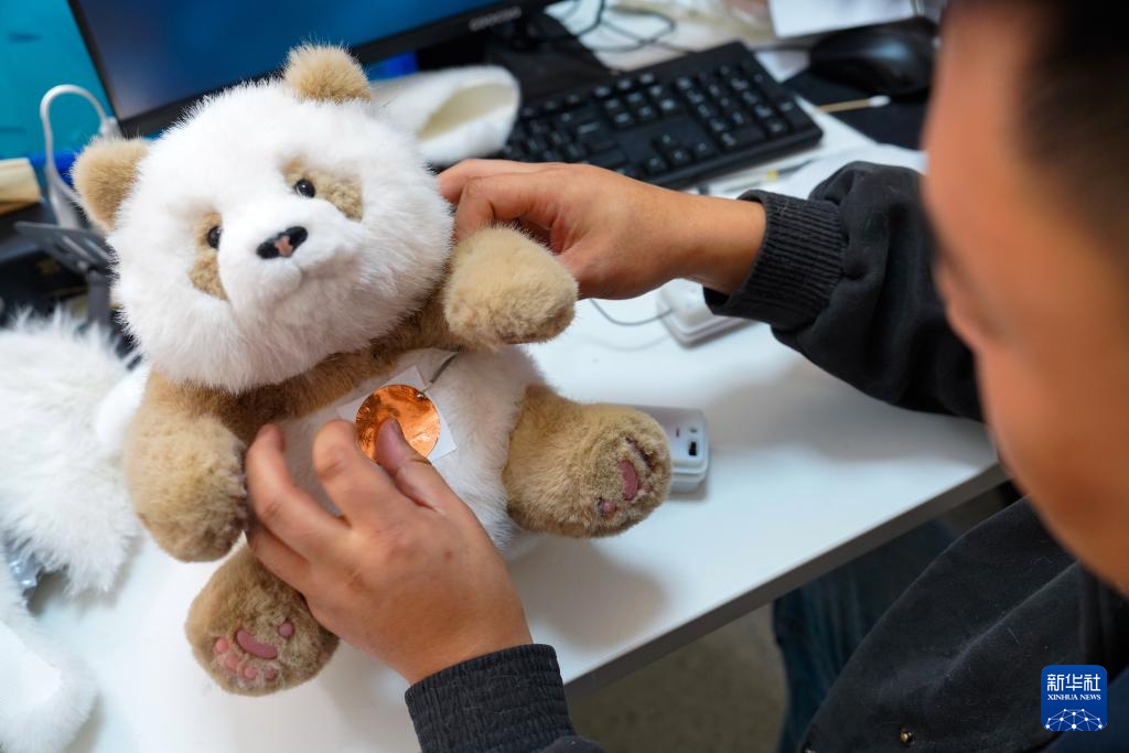 在位于四川省成都市的“西柚熊猫”,研发人员在检测高仿真大熊猫玩偶感应发声部位的工作情况(11月21日摄)。