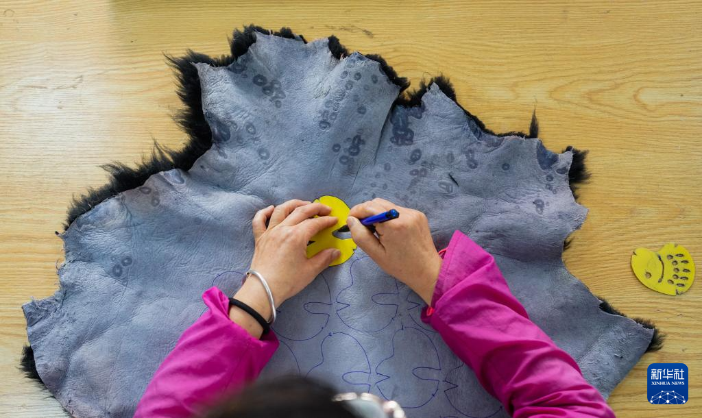 在位于四川省成都市的“西柚熊猫”生产车间,工人剪裁用于制作高仿真大熊猫玩偶部件的羊皮(11月21日摄)。