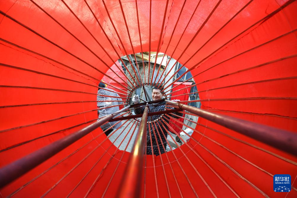 12月16日,在河北省石家庄市藁城区屯头村一家宫灯厂,宫灯艺人在制作大型宫灯。