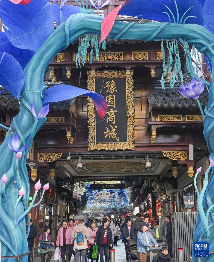 12月17日,游客在安装了灯组的上海豫园商城凝晖路游览。