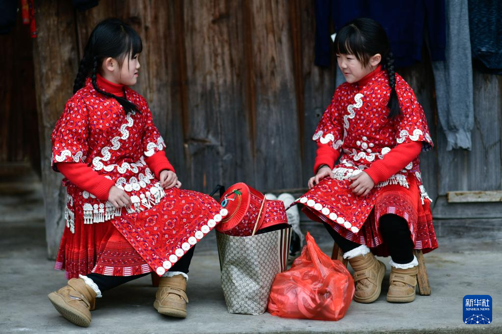 在贵州省凯里市舟溪镇舟溪村茶林苗寨,苗族双胞胎姐妹杨柠咛(左)、杨柠微在一起玩耍(2月15日摄)。