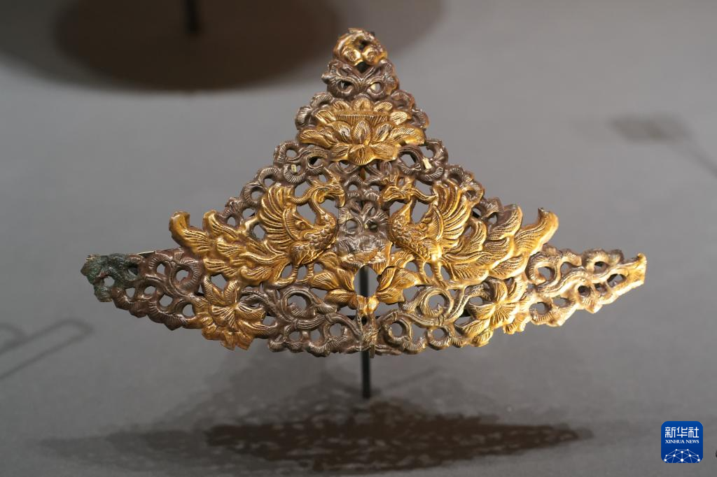 西部机场博物馆展出的唐代文物鎏金银钗(2月26日摄)。