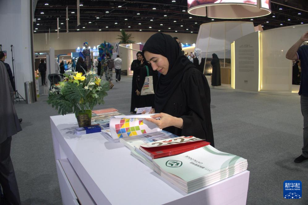 4月27日,在阿联酋阿布扎比国家展览中心,当地读者翻阅中国展台的图书。