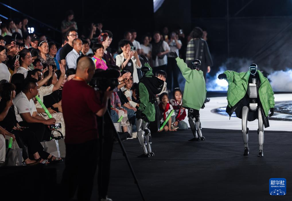 5月7日,在古镇音乐时装秀现场,人形机器人与观众互动。