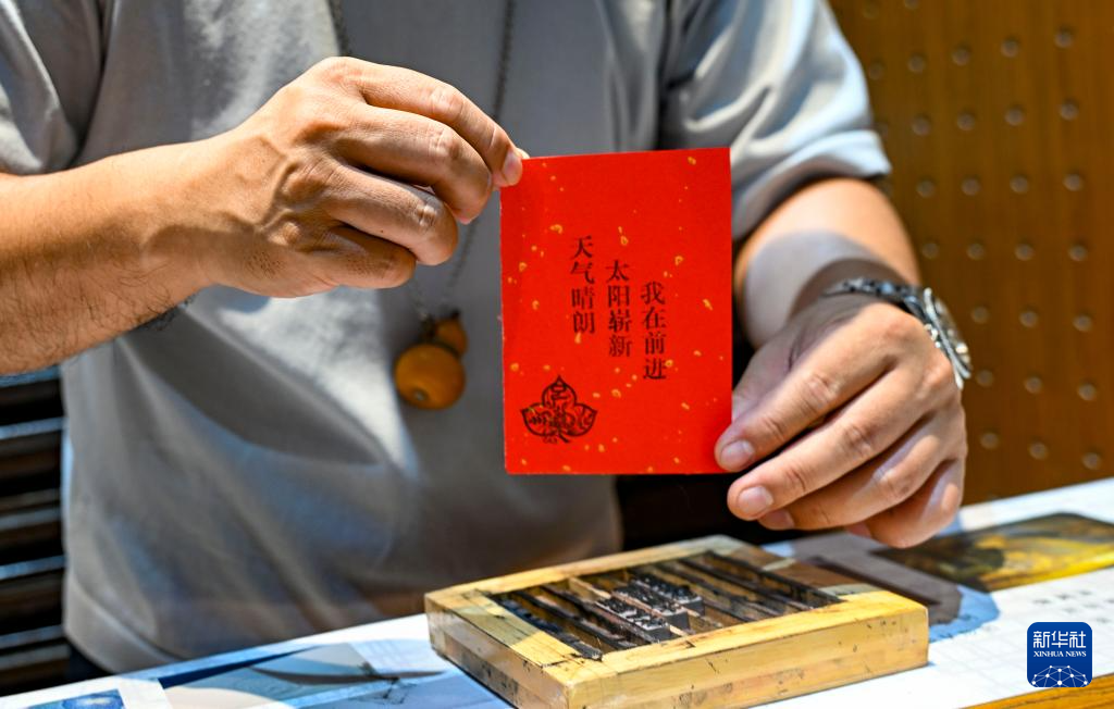 永庆坊一家活字印刷店店主赖朝阳展示自己的活字印刷作品(5月13日摄)。