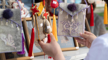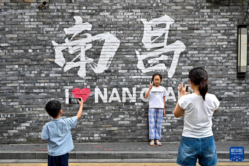 7月7日,游客在江西南昌滕王阁景区附近的半步街打卡留影。