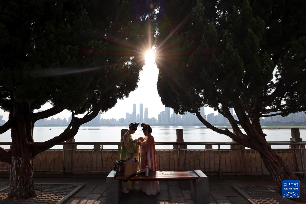 7月7日,游客在江西南昌滕王阁景区内休憩。