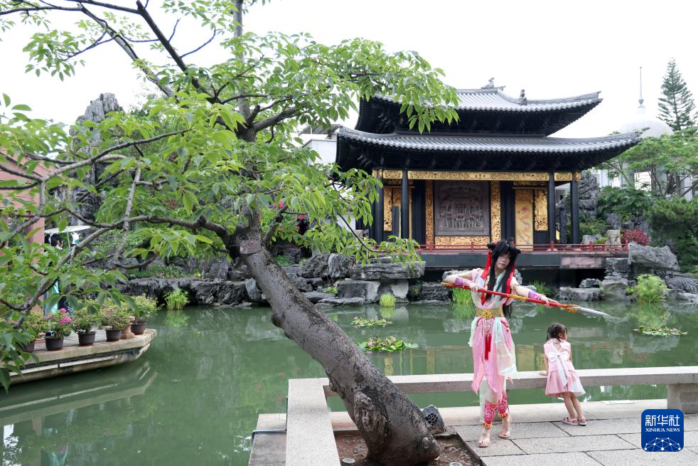 游客在位于永庆坊的粤剧艺术博物馆里拍照(7月11日摄)。