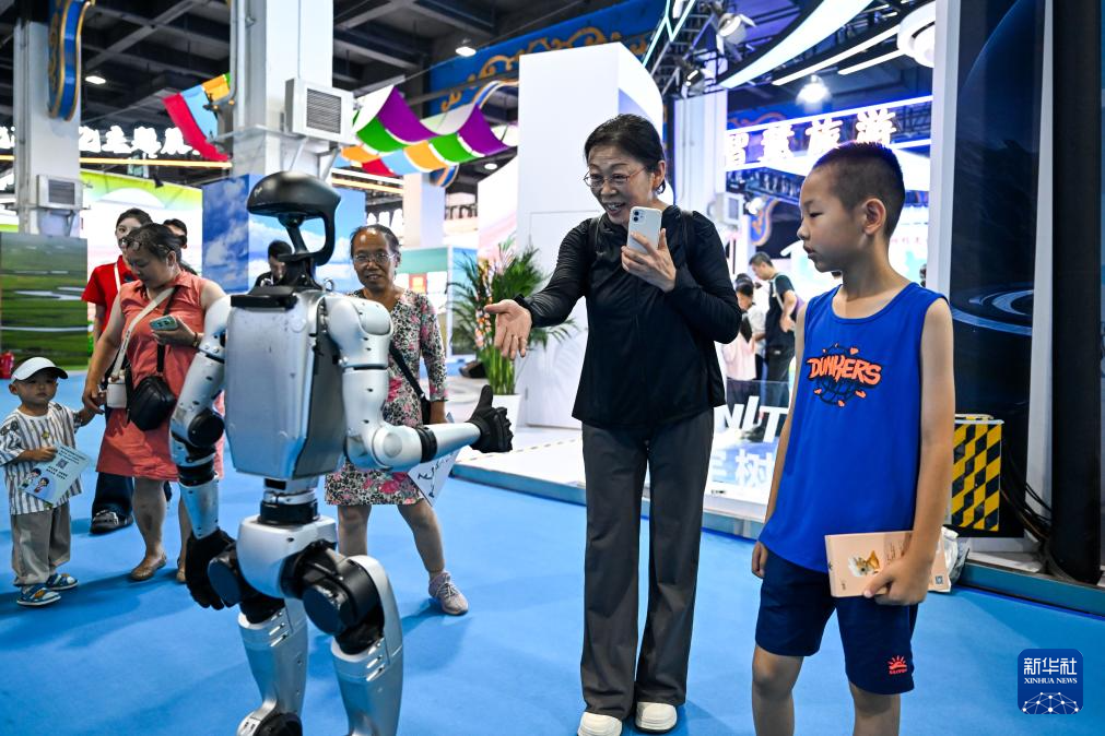 7月17日,观众在第九届内蒙古自治区文化产业博览交易会现场与机器人互动。