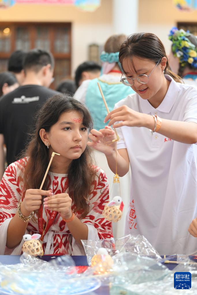 8月6日,上合国家青年学生在制作灯笼。