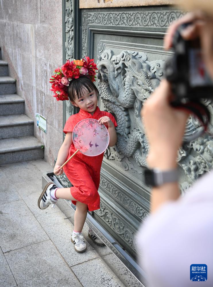 8月18日,福建泉州蟳埔村,一名体验“簪花围”的小游客在拍照留念。