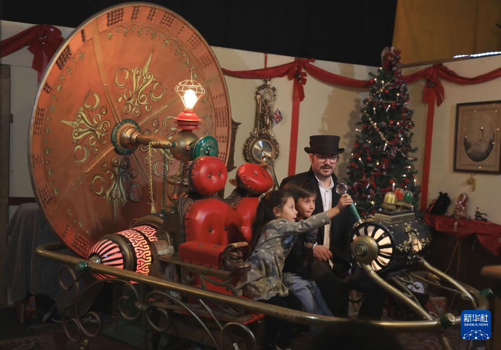 11月22日,在美国旧金山,小朋友在狄更斯圣诞博览会上操作“时光机”。