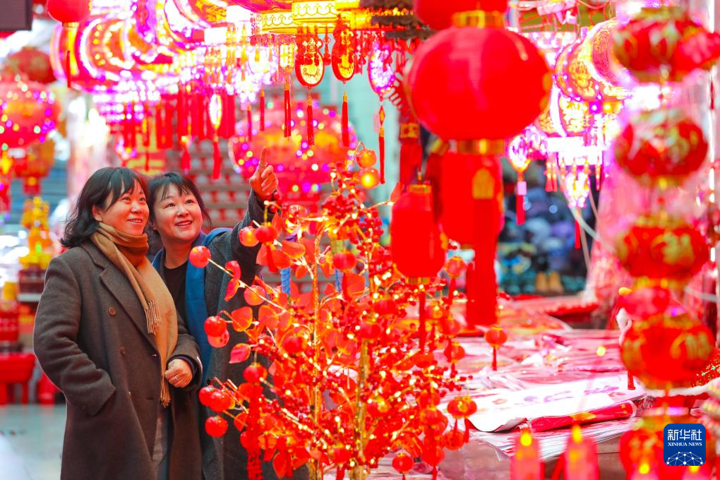 2月3日,市民在河南省开封市鼓楼区一年货市场选购春节饰品。