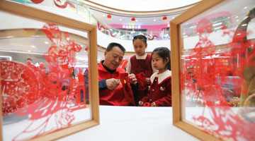 2月4日,在安华镇丰江周村的宗祠,村民在制作板凳龙花灯上的剪纸装饰。