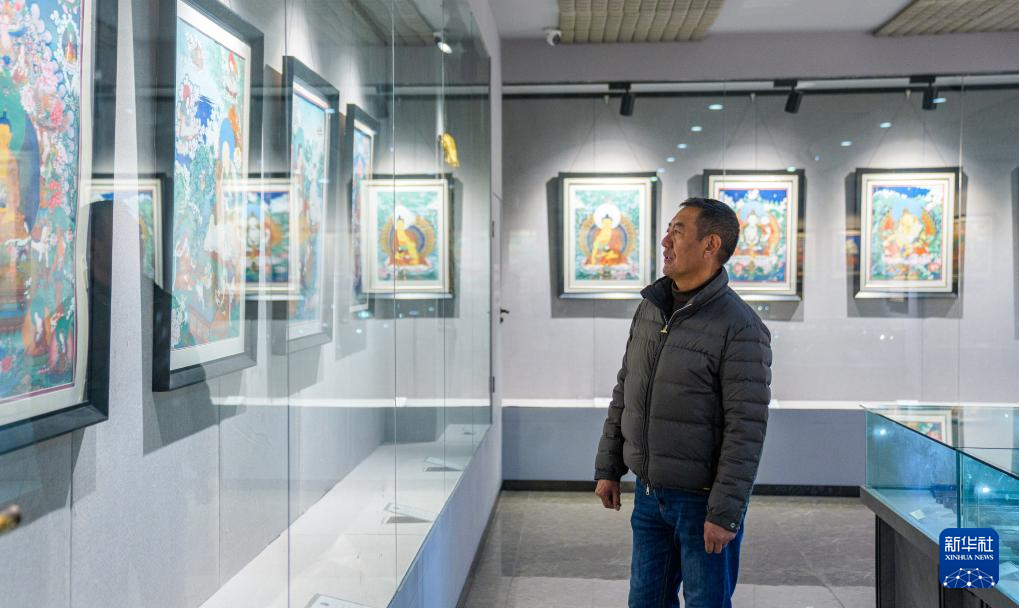 2月10日,罗布斯达在西藏唐卡画院的展厅里观赏自己的唐卡作品。
